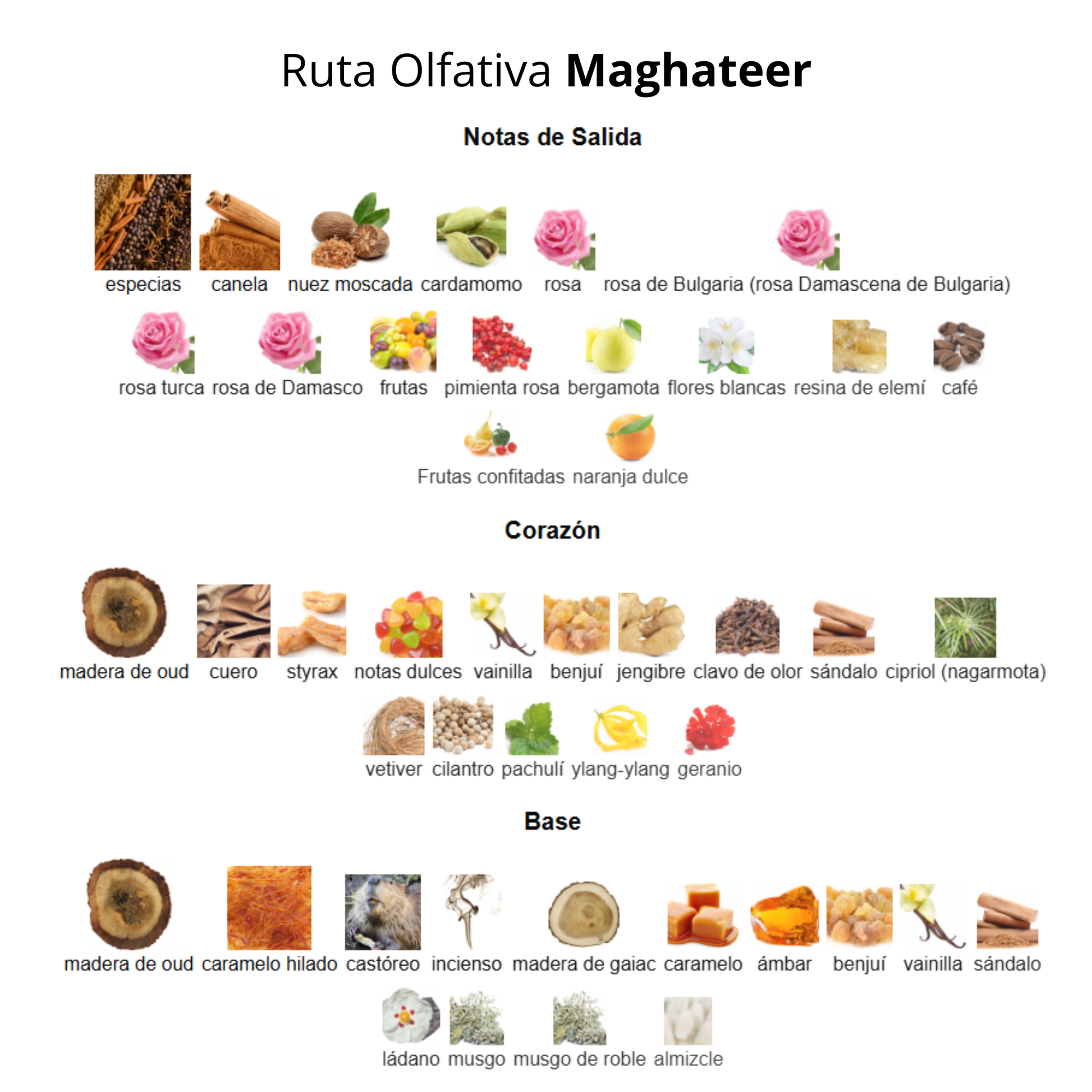 - Notas de corazón: Madera de oud, cuero, styrax, notas dulces, vainilla, benjuí, jengibre, clavo de olor, sándalo, cipriol (nagarmota), vetiver, cilantro, pachulí, ylang-ylang y geranio.